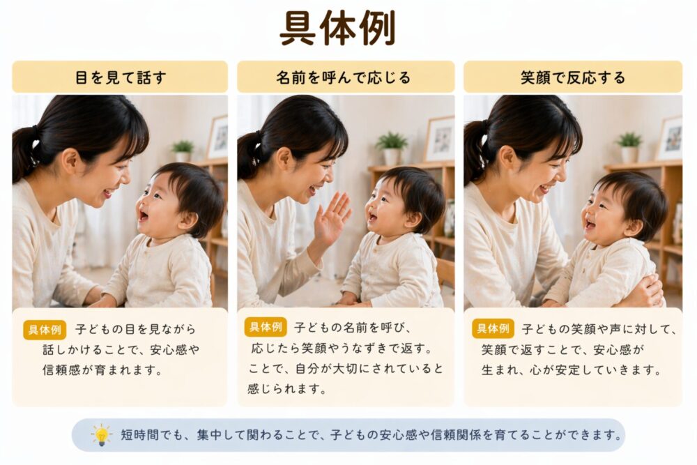 例えば子どもが泣いたときに一貫して応じることで信頼関係が形成されます。