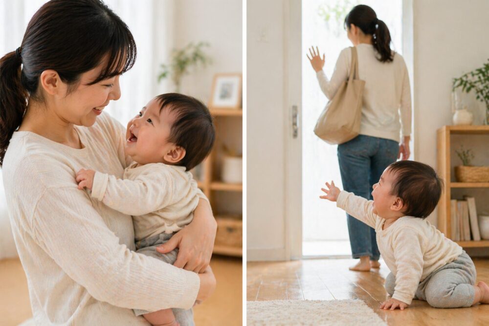 離れると不安を感じる行動(後追い)が見られることがあるが、これは自然な発達の一部です。