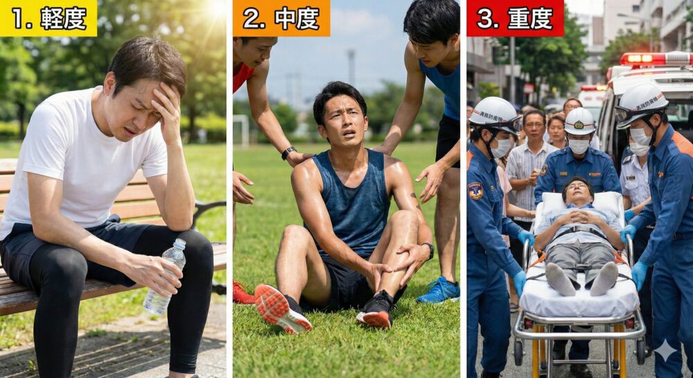 • 中度:大量発汗、筋肉のけいれん、判断力低下