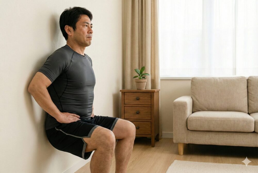 - 壁スクワット(腰と脚の連動性向上) (太ももが床と平行になる深さで保持 10秒×3セット、徐々に秒数増やす)