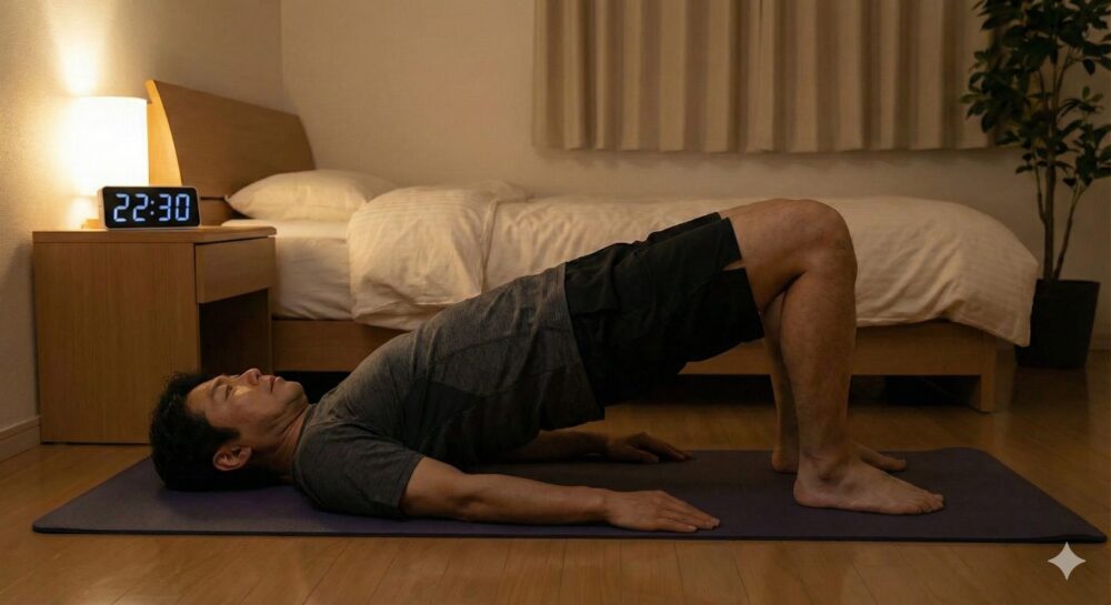 - バックブリッジ(背筋・お尻の強化):就寝前にもおすすめ (骨盤から背中が一直線になる姿を意識 20~30秒×3セット、膝は90°)