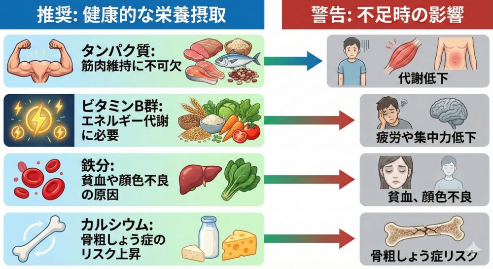 栄養失調が続くと、免疫力低下や慢性疲労、ホルモン異常による不妊リスクまで高まります。