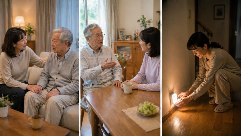転倒や事故を防ぐために環境を整えることが必要です。足元灯の設置や周囲の整理整頓が有効です。